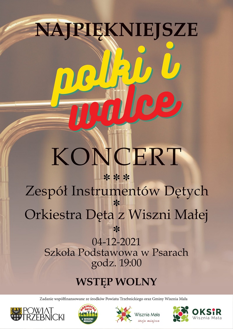 W ramach koncertu Najpiękniejsze Polki i Walce wystąpi Zespół Instrumentów Dętych oraz Orkiestra Dęta z Wiszni Małej. Organizatorem wydarzenia jest Ośrodek Kultury Sportu i Rekreacji w Wiszni Małej przy wsparciu Starostwa Powiatowego w Trzebnicy.